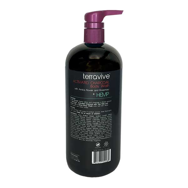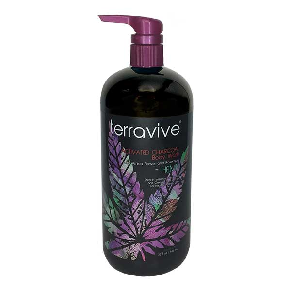 Terravive® Activated Charcoal Body Wash with Arnica Flower and Rosemary + Hemp. Rich in essential fatty acids and Omega 3, 6 and 9, for healthy looking skin. Paraben free.